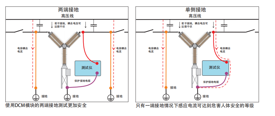 在所有變電站中,所有與高壓導(dǎo)體并行的導(dǎo)體都會(huì)通過(guò)電容性耦合感應(yīng)出有害或致命的電流。通過(guò)將被測(cè)試品的兩端接地,可將有害電流引入大地,從而為測(cè)試人員提供了一個(gè)安全的區(qū)域,詳見(jiàn)下圖。