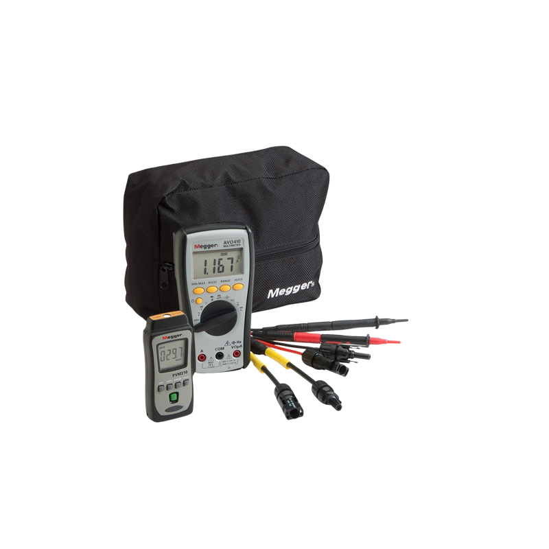 在光伏系統(tǒng)的安裝、調(diào)試和測(cè)試過程中,除了美格多功能測(cè)試儀(MFT)等常規(guī)電工測(cè)試設(shè)備外,還需要額外的儀器。Megger PVK320 光伏套件便提供了這類額外儀器,包含 PVM210 輻照度計(jì)、CAT IV 10A 直流 AVO410 萬用表以及一套光伏測(cè)試導(dǎo)線。