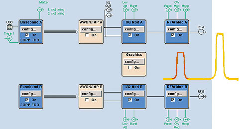 ?R&S?SMU200A具有現(xiàn)代直覺式用戶界面,可清晰顯示從基帶到射頻輸出整個(gè)過程的信號(hào)流框圖。每個(gè)方框代表一個(gè)儀器功能單元,所生成信號(hào)的情況一目了然,其中包括是否被加性高斯白噪聲和/或衰落干擾。