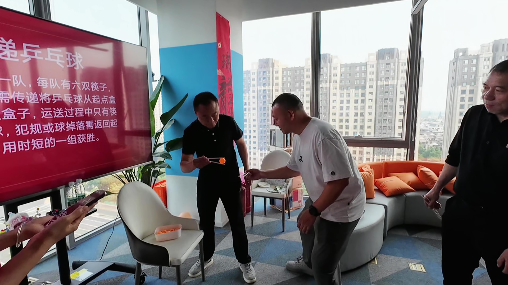 *先上場的是男生隊,雖然看起來很簡單,但真正操作起來卻充滿了挑戰(zhàn)。隨著游戲開始,現(xiàn)場氛圍變得緊張起來,每個人都全神貫注,手握筷子,眼神專注地盯著那顆小小的乒乓球。