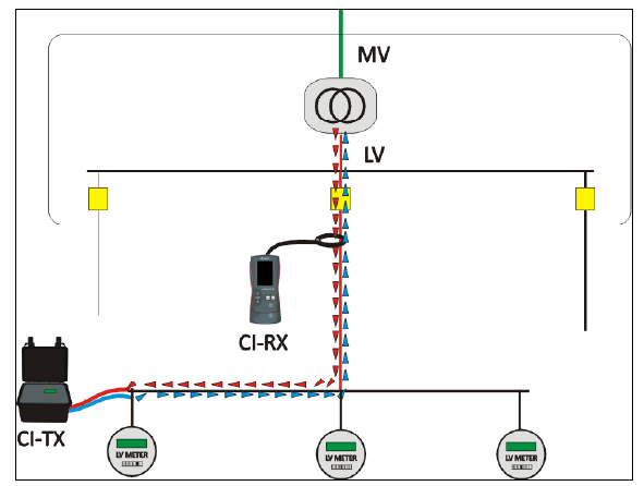將發(fā)射機(jī)CI-TX接在待測(cè)的終端或負(fù)載端,打開(kāi)發(fā)射機(jī),在電路中輸入異頻脈沖信號(hào),然后使用接收機(jī)CI-RX在另一端尋找信號(hào)。尋得信號(hào)電纜即為該發(fā)射機(jī)所在回路電纜。
