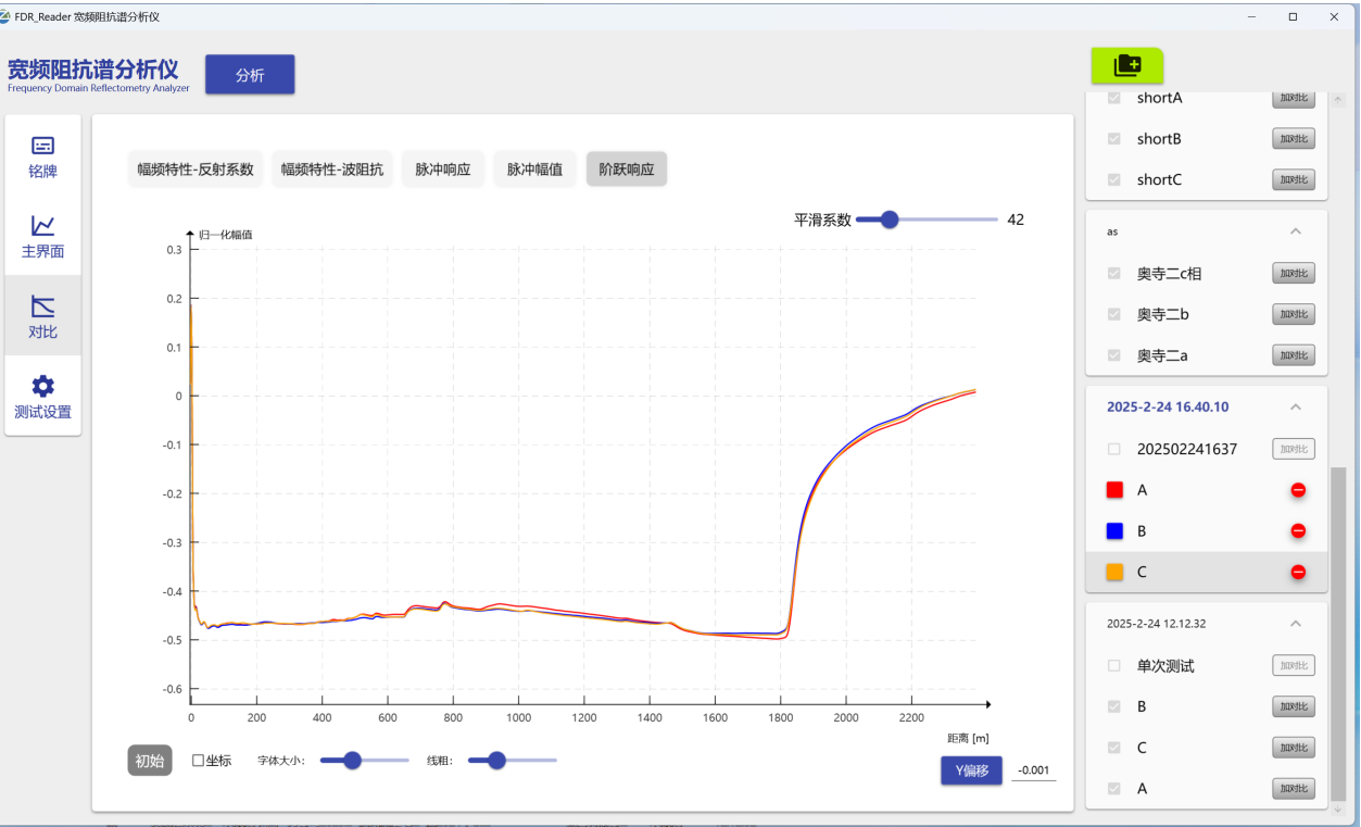 通過對A、B、C三相階躍響應(yīng)結(jié)果對比分析發(fā)現(xiàn),在879.04米處,三相的波阻抗歸一化幅值出現(xiàn)了明顯的分層階躍后大幅下降,該位置導(dǎo)致三相絕緣降低; 同時(shí)在650.25米處也出現(xiàn)了三相的階躍增幅,疑似該處發(fā)生了進(jìn)水,建議條件允許的情況下進(jìn)行檢查維護(hù)。