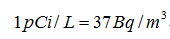 氡的濃度一般使用放射性活度單位,因此可以在各種檢測報告上看到測量結(jié)果為Bq/m3(貝克勒爾/立方米)或pCi/L(皮居里/升)。其中貝克勒爾為國際單位制單位,這兩個單位可以簡單地由下式轉(zhuǎn)換: