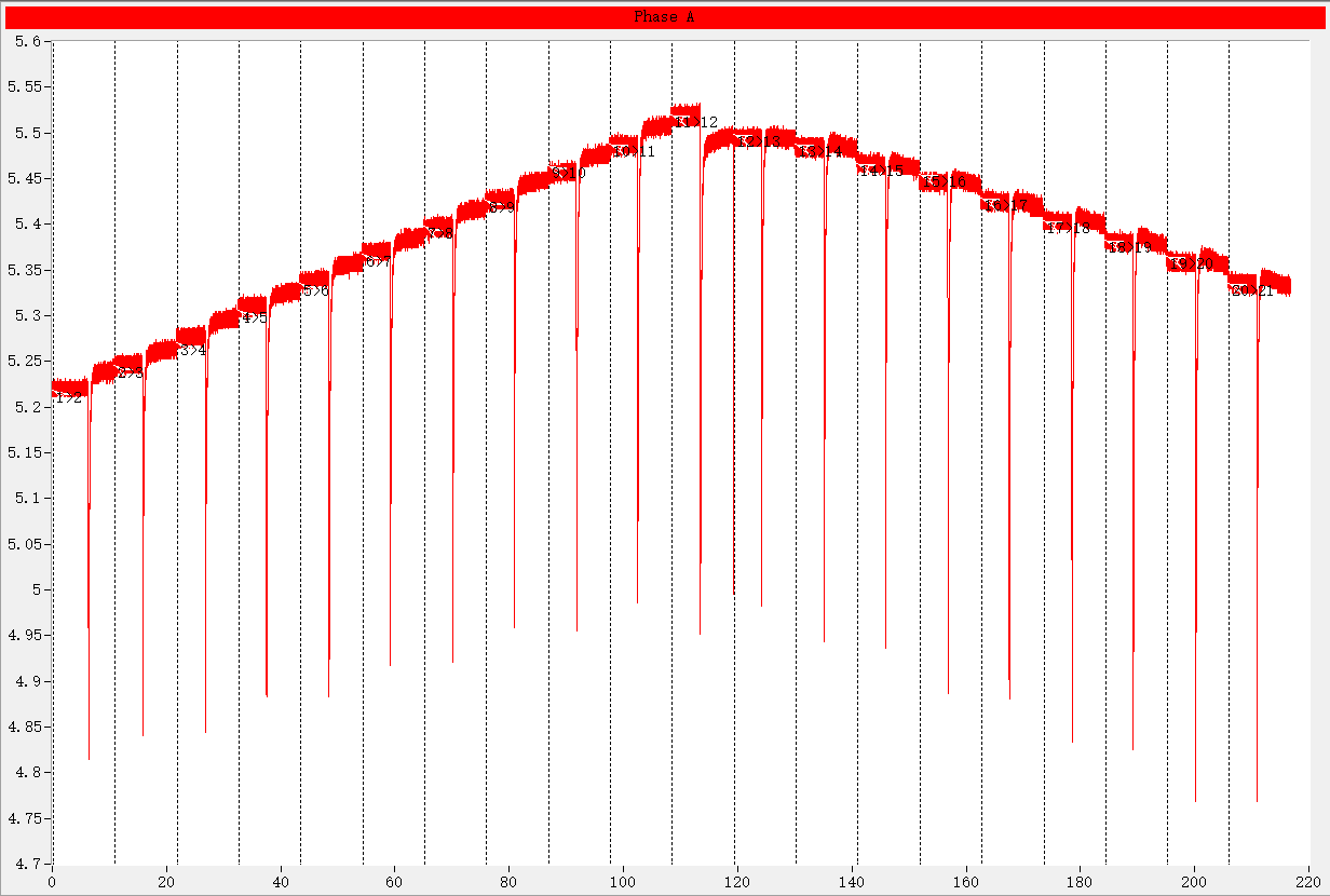 此方法是一種“指紋”測(cè)試技術(shù),在新出廠或大修后使用相同的測(cè)試設(shè)置可以檢查有載分接開關(guān)調(diào)檔線性度、開關(guān)位置、過渡時(shí)間、紋波變化,對(duì)應(yīng)如觸點(diǎn)磨損,松動(dòng),切換開關(guān)電阻器損壞,異常電弧等故障問題。