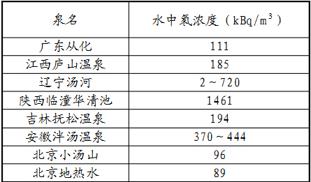 四、生活用水中的氡易溶于水,其半衰期很短,可以從水中迅速衰變逸出。因此地表水中氡含量較低,基本上不存在因水而來的氡問題。城市中在對水進行處理時,會將水暴露于空氣中,使氡可以逸出,因此也不會帶來大的氡污染。然而在以地下水作為直接用水來源的地區(qū)(以農村為主),則可能因為供水系統(tǒng)封閉導致氡不能及時逸出,而通過淋浴或其他家庭活動釋放出來,增加室內氡濃度,甚至對室內氡污染起到支配作用。值得一提的是,溫泉和地熱水都來自地下深部,氡含量較高。(表3) 表3溫泉和地熱水中的氡濃度。