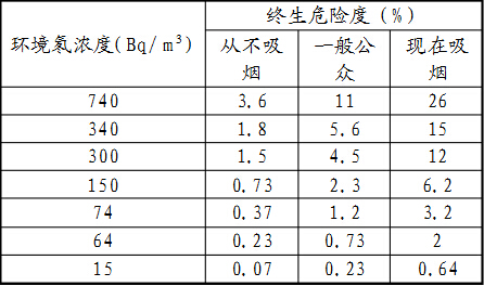 五、一般情況下,由于室外氡濃度較低,保持良好的通風*能有效地減低室內氡濃度。然而在室外氡濃度較高的地區(qū)應適當減少開窗通風,防止室外氡過多進入室內。另外,由于氡在人體內組織的溶解度不是很高,人體一旦脫離含氡環(huán)境,氡會很快經肺排出。當人進入含有較高濃度氡的環(huán)境時,30~40min吸入和呼出的氡達到平衡,當離開此環(huán)境1h后,90%的氡被排出。所以早上做戶外運動有利于晚上吸入氡的排出。除了室內氡濃度外,吸煙也對人體受到危害有很大貢獻。據研究顯示,吸煙與氡共同作用于人體將使人體患肺癌的幾率成倍增長。以下是氡及其子體致肺癌的終生危險度,表中加入了吸煙給患肺癌帶來的影響。(表4)